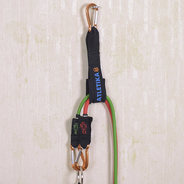 - В петлю фиксатора проденьте одну или несколько эластичных трубок эспандера